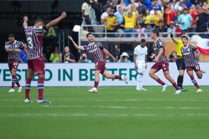 (250705) -- ORLANDO, 5 julio, 2025 (Xinhua) -- Imagen del 4 de julio de 2025 de Mattheus Martinelli (c), de Fluminense FC, festejando su anotación durante el partido de cuartos de final entre Fluminense FC, de Brasil, y Al Hilal, de Arabia Saudita, en la Copa Mundial de Clubes de la FIFA 2025, en el Camping World Stadium, en Orlando, Florida, Estados Unidos. (Xinhua/Xu Chang) (rtg) (da)