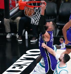 (250225) -- SACRAMENTO, 25 febrero, 2025 (Xinhua) -- Imagen del 24 de febrero de 2025 de Jonas Valanciunas (i), de Sacramento Kings, encestando durante el partido de la temporada regular 2024-2025 de la NBA entre Sacramento Kings y Charlotte Hornets, en Sacramento, Estados Unidos. (Xinhua/Sun Yuxuan) (oa) (ah) (ce)