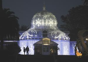(251216) -- SAN FRANCISCO, 16 diciembre, 2025 (Xinhua) -- Imagen del 15 de diciembre de 2025 de personas observando un espectáculo de luz en el Conservatorio de Flores del Golden Gate Park, en San Francisco, Estados Unidos. (Xinhua/Liu Yilin) (oa) (ah) (vf)