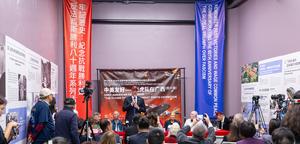 (250422) -- SAN FRANCISCO, 22 abril, 2025 (Xinhua) -- Imagen del 21 de abril de 2025 de invitados asistiendo a la ceremonia de inauguración de la exposición fotográfica titulada "Amistad Sino-Estadounidense: Tigres Voladores en Guangxi" en el Salón Conmemorativo de la Guerra del Pacífico de la Segunda Guerra Mundial, en el Barrio Chino de San Francisco, Estados Unidos. Descendientes de los Tigres Voladores, junto con funcionarios estadounidenses y chinos y activistas de la historia de la Segunda Guerra Mundial, se reunieron aquí el lunes para inaugurar una nueva exposición fotográfica que honra el vínculo histórico entre los pueblos estadounidense y chino durante su lucha conjunta contra el fascismo en la Segunda Guerra Mundial. (Xinhua/Dong Xudong) (jg) (ra) (ce)