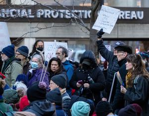 (250211) -- WASHINGTON, 11 febrero, 2025 (Xinhua) -- Imagen del 10 de febrero de 2025 de personas asistiendo a una protesta en apoyo a la Oficina de Protección Financiera del Consumidor de Estados Unidos (CFPB, por sus siglas en inglés) en la sede de la CFPB, en Washington D.C., Estados Unidos. La sede de la CFPB en Washington D.C. permanecerá cerrada de lunes a viernes, según los medios de comunicación locales. No se dio ninguna razón para el cierre repentino. (Xinhua/Hu Yousong) (oa) (vf)