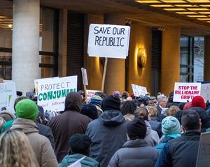 (250211) -- WASHINGTON, 11 febrero, 2025 (Xinhua) -- Imagen del 10 de febrero de 2025 de personas asistiendo a una protesta en apoyo a la Oficina de Protección Financiera del Consumidor de Estados Unidos (CFPB, por sus siglas en inglés) en la sede de la CFPB, en Washington D.C., Estados Unidos. La sede de la CFPB en Washington D.C. permanecerá cerrada de lunes a viernes, según los medios de comunicación locales. No se dio ninguna razón para el cierre repentino. (Xinhua/Hu Yousong) (oa) (vf)