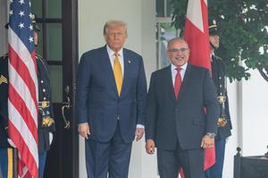 (250718) -- WASHINGTON, 18 julio, 2025 (Xinhua) -- Imagen del 16 de julio de 2025 del presidente estadounidense, Donald Trump (i), recibiendo al príncipe heredero y primer ministro de Bahréin, Salman bin Hamad Al Khalifa, en la Casa Blanca, en Washington D. C., Estados Unidos. Trump presentó el miércoles un plan para imponer una tarifa unificada a más de 150 países y regiones, según informó el medio Politico. "Será la misma para todos, para ese grupo", declaró Trump a la prensa durante un encuentro con el príncipe heredero de Bahréin, Salman bin Hamad Al Khalifa, en la Casa Blanca. (Xinhua/Hu Yousong) (rtg) (ra) (vf)