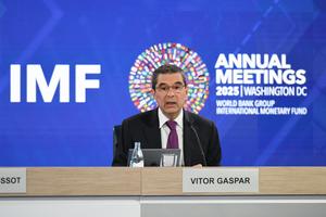 (251015) -- WASHINGTON, 15 octubre, 2025 (Xinhua) -- Vitor Gaspar, director saliente del Departamento de Asuntos Fiscales del Fondo Monetario Internacional (FMI), habla en una conferencia de prensa sobre el Monitor Fiscal, en Washington, D.C., Estados Unidos, el 15 de octubre de 2025. El director fiscal del FMI dijo que es más importante que los gobiernos "ofrezcan una buena relación calidad precio" que simplemente gastar más, señalando que la eficiencia del gasto es un "elemento extremadamente importante" en las finanzas públicas. (Xinhua/Li Rui) (jg) (da) (vf)