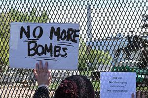 (260408) -- WASHINGTON, 8 abril, 2026 (Xinhua) -- Imagen del 7 de abril de 2026 de un manifestante sosteniendo pancartas frente a la Casa Blanca, en Washington D. C., Estados Unidos. El presidente de Estados Unidos, Donald Trump, indicó el martes que aceptó "suspender el bombardeo y ataque contra Irán durante un período de dos semanas". Trump publicó en redes sociales que su decisión está "sujeta a" que Irán acepte una apertura total, inmediata y segura del estrecho de Ormuz. (Xinhua/Li Rui) (jg) (ra) (ce)