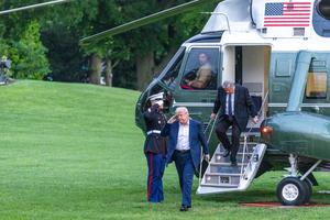 (250505) -- WASHINGTON, D.C., 5 mayo, 2025 (Xinhua) -- Imagen del 4 de mayo de 2025 del presidente estadounidense, Donald Trump (c-frente), saludando a su llegada al Jardín Sur de la Casa Blanca, en Washington, D.C., Estados Unidos. Trump anunció el domingo que autorizó el inicio inmediato de un proceso para imponer un arancel del 100 por ciento a todas las películas "producidas en tierras extranjeras". (Xinhua/Hu Yousong) (rtg) (ah) (ce)