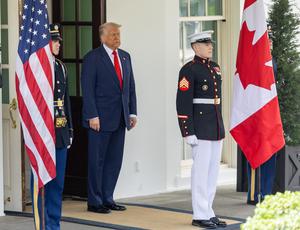 (250506) -- WASHINGTON, 6 mayo, 2025 (Xinhua) -- El presidente de estadounidense, Donald Trump (c), espera para recibir al primer ministro canadiense, Mark Carney, en la Casa Blanca, en Washington, D.C., Estados Unidos, el 6 de mayo de 2025. Estados Unidos cesará los ataques contra el grupo yemení hutí, dijo el martes el presidente estadounidense, Donald Trump, luego de una campaña de bombardeos de cerca de dos meses. (Xinhua/Hu Yousong) (oa) (ah) (ce)
