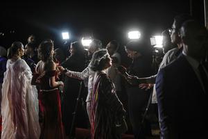 (250502) -- ASUAN, 2 mayo, 2025 (Xinhua) -- Invitadas son entrevistadas durante una ceremonia de alfombra roja del 9º Festival Internacional de Cine de Mujeres de Asuán (AIWFF, por sus siglas en inglés), en Asuán, Egipto, el 2 de mayo de 2025. La novena edición del AIWFF se inauguró aquí el viernes por la tarde con una ceremonia de alfombra roja. (Xinhua/Ahmed Gomaa) (rtg) (ra) (ce)
