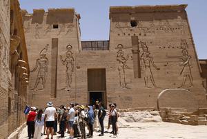 (250512) -- EL CAIRO, 12 mayo, 2025 (Xinhua) -- Imagen del 3 de mayo de 2025 de turistas visitando el complejo del Templo File cerca del río Nilo, en Asuán, Egipto. Construidas durante el periodo ptolemaico y dedicadas a la diosa Isis, las estructuras del Tempo File presentan capiteles florales, muros cubiertos de jeroglíficos y relieves de deidades antiguas. (Xinhua/Ahmed Gomaa) (rtg) (ah) (vf)