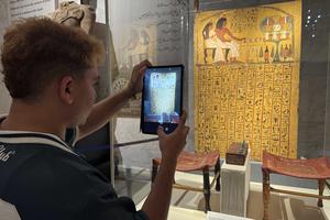 (250814) -- EL CAIRO, 14 agosto, 2025 (Xinhua) -- Imagen del 7 de agosto de 2025 del desarrollador egipcio de aplicaciones, Ahmed El-Kholy, probando la función de realidad aumentada (RA) de su aplicación Manetho en un artefacto en el Museo Nacional de la Civilización Egipcia, en El Cairo, Egipto. El desarrollador de aplicaciones egipcio, Ahmed El-KholyEl-Kholy, calificó a Manetho como "el primer traductor de jeroglíficos en tiempo real del mundo que utiliza inteligencia artificial". (Xinhua/Ahmed Gomaa) (jg) (ah)