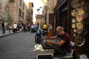 (251023) -- EL CAIRO, 23 octubre, 2025 (Xinhua) -- Imagen del 22 de octubre de 2025 de un artesano elaborando artesanías de cobre en una antigua calle cerca del antiguo mercado de Khan el-Khalili, en El Cairo, Egipto. Ubicado en el corazón del antiguo distrito islámico de El Cairo, el centenario mercado de Khan el-Khalili es considerado una de las atracciones turísticas más populares de Egipto. (Xinhua/Sui Xiankai) (da) (ra) (ce)