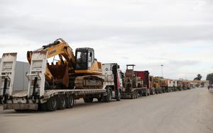 (250225) -- CRUCE FRONTERIZO DE RAFAH, 25 febrero, 2025 (Xinhua) -- Imagen del 24 de febrero de 2025 de vehículos de ingeniería esperando para ingresar a Gaza desde el lado egipcio del cruce fronterizo de Rafah. Desde que el alto al fuego entre Hamás e Israel entró en vigor el 19 de enero, 680 pacientes palestinos y 1.850 acompañantes procedentes de la Franja de Gaza han cruzado a Egipto a través del cruce de Rafah, informó el miércoles el centro de prensa de Egipto. El comunicado añadió que 7.000 camiones que transportaban más de 130.000 toneladas de ayuda y 20.000 tiendas de campaña han llegado a Gaza a través de los cruces egipcios con Israel y Gaza. El cruce fue reabierto desde el lado egipcio el 19 de enero como parte del acuerdo de cese al fuego. Israel ha controlado el lado palestino del cruce desde mayo de 2024. (Xinhua/Wang Dongzhen) (jg) (ra) (vf)