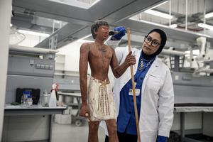 (250913) -- EL CAIRO, 13 septiembre, 2025 (Xinhua) -- Imagen del 2 de septiembre de 2025 de una conservadora trabajando en una estatua antigua en un laboratorio de conservación del Museo Nacional de la Civilización Egipcia (NMEC, por sus siglas en inglés), en El Cairo, Egipto. (Xinhua/Ahmed Gomaa) (oa) (da)