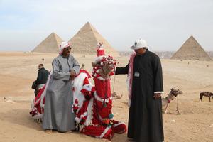 (260101) -- GIZA, 1 enero, 2026 (Xinhua) -- Un camello adornado con decoraciones de temática de Santa Claus es visto en las Pirámides de Giza, Egipto, el 1 de enero de 2026. (Xinhua/Ahmed Gomaa) (da) (ra) (vf)