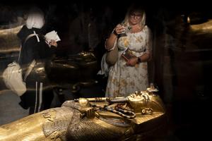 (251221) -- GIZA, 21 diciembre, 2025 (Xinhua) -- Imagen del 20 de diciembre de 2025 de personas observando el Ataúd Interior de Oro Sólido de Tutankamón en la sala de exposiciones del rey Tutankamón del Gran Museo Egipcio, en Giza, Egipto. El Gran Museo Egipcio abrió sus puertas al público el 4 de noviembre, consolidándose como una de las mayores exposiciones de reliquias antiguas del mundo y una fortaleza de alta tecnología dedicada a la conservación del patrimonio. Las galerías principales exhiben por primera vez miles de antigüedades que antes estaban almacenadas, y albergan la colección completa de unos 5.992 artefactos de la tumba del niño rey Tutankamón. (Xinhua/Xin Mengchen) (oa) (ah