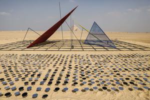 (251111) -- EL CAIRO, 11 noviembre, 2025 (Xinhua) -- Una instalación artística es exhibida durante la exposición internacional de arte "Por Siempre es Ahora" en el punto escénico de las Pirámides de Giza, en Giza, Egipto, el 11 de noviembre de 2025. La quinta edición de la exposición internacional de arte "Por Siempre es Ahora" comenzó el martes en el área del punto escénico de las Pirámides de Giza de Egipto, presentando 10 obras de artistas de diferentes países. (Xinhua/Ahmed Gomaa) (jg) (ra) (ce)