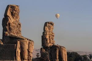 (251004) -- LUXOR, 4 octubre, 2025 (Xinhua) -- Un globo aerostático es visto cerca de los Colosos de Memnón en la ribera occidental del río Nilo, en Luxor, Egipto, el 4 de octubre de 2025. Luxor, capital del antiguo Alto Egipto conocida como Tebas, es un destino turístico famoso por sus edificios históricos del templo y otras reliquias. Hoy en día los viajes en globo aerostático son una opción popular para los turistas que visitan Luxor. (Xinhua/Ahmed Gomaa) (oa) (ra) (ce)