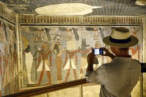 (251004) -- LUXOR, 4 octubre, 2025 (Xinhua) -- Un turista toma fotografías mientras visita la tumba del faraón Amenhotep III del Imperio Nuevo, en el Valle de los Reyes, en la ribera occidental de Luxor, Egipto, el 4 de octubre de 2025. El Ministerio de Turismo y Antigüedades de Egipto abrió el sábado al público la tumba del faraón Amenhotep III del Imperio Nuevo en el Valle de los Reyes, después de más de dos décadas de restauración. (Xinhua/Ahmed Gomaa) (oa) (ra) (ce)