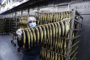 (250421) -- PUERTO SAID, 21 abril, 2025 (Xinhua) -- Imagen del 19 de abril de 2025 de un trabajador mostrando pescados salados en una fábrica, en Puerto Saíd, Egipto. Al amanecer del lunes de Pascua ortodoxa, los egipcios de todas las religiones se reúnen en parques, balcones y riberas de los ríos, sosteniendo en sus manos platos de fesikh, un plato de pescado fermentado y picante que ha sido la base del festival milenario del país, Sham El-Nessim, desde los tiempos de los faraones. (Xinhua/Ahmed Gomaa) (rtg) (ah) (ce)