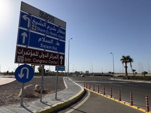 (251008) — EL CAIRO, 8 octubre, 2025 (Xinhua) — Imagen del 8 de octubre de 2025 de señales de tráfico, en Sharm el-Sheikh, Egipto. Las negociaciones indirectas entre Hamás e Israel iniciaron el miércoles por tercer día en la localidad turística egipcia de Sharm el-Sheikh, en el mar Rojo. (Xinhua) (ah) (ra) (vf)