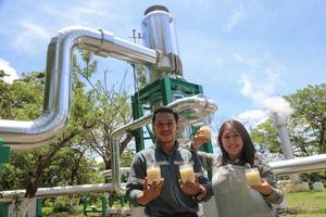 (250704) — AHUACHAPAN, 4 julio, 2025 (Xinhua) — Imagen del 1 de junio de 2025 de René Flores (i), responsable de Proyectos de la Fundación LAGEO, junto a Alejandra Calderón (d), habitante de la zona y participante en varios programas comunitarios, mostrando velas creadas con geotermia en las instalaciones de LaGeo, la empresa estatal a cargo de la operación de la Central Geotérmica Ahuachapán, en el departamento de Ahuachapán, El Salvador. Con más medio siglo de convertir el calor de la tierra en electricidad limpia, El Salvador es reconocido actualmente por ser el líder centroamericano en generación de energía geotérmica y hacer de esta una fuente de desarrollo. (Xinhua/Alexander Peña) (ap) (jg) (da) (ce)