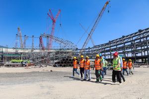 (260219) -- LA LIBERTAD, 19 febrero, 2026 (Xinhua) -- Imagen del 16 de febrero de 2026 de trabajadores de la empresa constructora China State Construction caminando por el sitio de construcción del proyecto del Estadio Nacional de El Salvador, previo a la celebración del Año Nuevo chino, en el departamento de La Libertad, El Salvador. (Xinhua/Alexander Peña) (ap) (jg) (ah) (ce)
