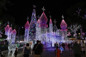 (251224) -- LA LIBERTAD, 24 diciembre, 2025 (Xinhua) -- Imagen del 23 de diciembre de 2025 de personas caminando entre instalaciones de luces navideñas durante la temporada navideña, en el departamento de La Libertad, El Salvador. (Xinhua/Alexander Peña) (ap) (jg) (da) (vf)