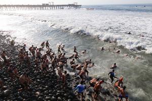 (260315) -- LA LIBERTAD, 15 marzo, 2026 (Xinhua) -- Guardavidas se lanzan al mar durante la 60ª edición de la prueba de resistencia acuática "Paso del Hombre", organizada por la Cruz Roja Salvadoreña, en el puerto de La Libertad, en el departamento de La Libertad, El Salvador, el 15 de marzo de 2026. (Xinhua/Alexander Peña) (ap) (ah) (da) (ce)