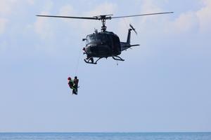 (260315) -- LA LIBERTAD, 15 marzo, 2026 (Xinhua) -- Guardavidas realizan un simulacro de rescate con helicóptero durante la 60ª edición de la prueba de resistencia acuática "Paso del Hombre", organizada por la Cruz Roja Salvadoreña, en el puerto de La Libertad, en el departamento de La Libertad, El Salvador, el 15 de marzo de 2026. (Xinhua/Alexander Peña) (ap) (ah) (da) (ce)