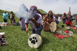 (250622) -- LA LIBERTAD, 22 junio, 2025 (Xinhua) -- Líderes de comunidades indígenas participan en la celebración del solsticio de verano en el Sitio Arqueológico San Andrés, en el departamento de La Libertad, El Salvador, el 22 de junio de 2025. Decenas de personas celebraron este domingo el solsticio de verano en el Sitio Arqueológico San Andrés, en el departamento de La Libertad, El Salvador, con una tradicional ceremonia que incluyó danzas y ofrendas de la cultura maya. (Xinhua/Alexander Peña) (ap) (oa) (da)