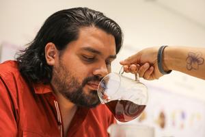 (250321) -- SAN SALVADOR, 21 marzo, 2025 (Xinhua) -- Imagen del 18 de marzo de 2025 de un hombre percibiendo el aroma de una bebida a base de café, en la cafetería "Alquimia Coffee", en el departamento de San Salvador, El Salvador. El aroma a café despierta los sentidos antes del primer sorbo, cálido y envolvente. Al degustarlo, evoca recuerdos en quienes visitan "Alquimia Coffee", una encantadora cafetería localizada en la capital salvadoreña que ofrece una experiencia única, marcada por la constante interacción entre los "alquimistas" (baristas) y los amantes de esta deliciosa infusión. (Xinhua/Alexander Peña) (ap) (jg) (ra) (ce)