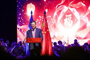 (260210) -- SAN SALVADOR, 10 febrero, 2026 (Xinhua) -- Imagen del 9 de febrero de 2026 del embajador de China en El Salvador, Zhang Yanhui, pronunciando un discurso durante un concierto de gala por el Año Nuevo chino en el Teatro Presidente, en el departamento de San Salvador, capital de El Salvador. Jóvenes, niños y adultos disfrutaron de un concierto de gala en El Salvador para celebrar la próxima llegada del Año Nuevo chino, una velada en la que más de un centenar de integrantes de la Orquesta Sinfónica de San Salvador interpretaron una veintena de piezas cargadas de emoción, energía, tradición y esperanza, destacando el valor de la música como un puente de entendimiento cultural entre naciones. (Xinhua/Alexander Peña) (ap) (oa) (ah) (vf)