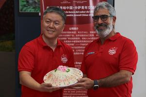 (250626) -- SAN SALVADOR, 26 junio, 2025 (Xinhua) -- Imagen del 24 de junio de 2025 del fundador de la empresa china Jack & King's, Jack Huang (i), y el empresario propietario de Multicongelados y BIGGEST de El Salvador, Eduardo Salume (d), posando con una receta de comida china durante el encuentro cultural titulado "La Gastronomía China llega a los Campus de Centroamérica" organizado por la Universidad de El Salvador (UES), Diario El Salvador, el Instituto Confucio de la UES, así como Jack & King's, como parte del Programa de Intercambio Cultural Juvenil China-El Salvador, en el departamento de San Salvador, El Salvador. Entre sabores intensos y técnicas ancestrales, la gastronomía china llegó a tierras salvadoreñas para cautivar a los jóvenes en un evento de intercambio cultural que combinó el sabor, la tradición y el aprendizaje en la UES, la casa de estudios más importante del país centroamericano. (Xinhua/Alexander Peña) (ap) (jg) (da) (vf)