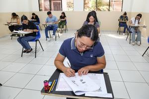 (251206) -- SAN SALVADOR, 6 diciembre, 2025 (Xinhua) -- Alumnos realizan las primeras pruebas de certificación del idioma chino mandarín en el Instituto Confucio de la Universidad de El Salvador (UES), en el departamento de San Salvador, El Salvador, el 6 de diciembre de 2025. El Instituto Confucio de la UES develó el sábado la placa que lo acredita como el primer centro autorizado para aplicar las pruebas de certificación del idioma chino mandarín HSK en la región CA-4 (El Salvador, Guatemala, Honduras y Nicaragua), un paso considerado "histórico" para la formación lingüística en el país. (Xinhua/Alexander Peña) (ap) (jg) (da)
