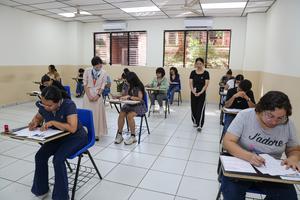 (251206) -- SAN SALVADOR, 6 diciembre, 2025 (Xinhua) -- Las profesoras chinas Wu Fengming (i-arriba) y Wang Yuhan (d-arriba) supervisan a alumnos que realizan las primeras pruebas de certificación del idioma chino mandarín en el Instituto Confucio de la Universidad de El Salvador (UES), en el departamento de San Salvador, El Salvador, el 6 de diciembre de 2025. El Instituto Confucio de la UES develó el sábado la placa que lo acredita como el primer centro autorizado para aplicar las pruebas de certificación del idioma chino mandarín HSK en la región CA-4 (El Salvador, Guatemala, Honduras y Nicaragua), un paso considerado "histórico" para la formación lingüística en el país. (Xinhua/Alexander Peña) (ap) (jg) (da)