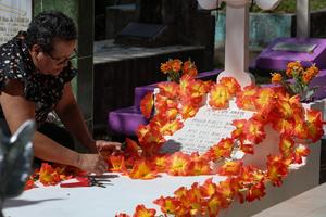 (251102) -- SAN SALVADOR, 2 noviembre, 2025 (Xinhua) -- Una mujer adorna una tumba con flores durante la conmemoración del Día de los Difuntos en el Cementerio de Los Ilustres, en el departamento de San Salvador, capital de El Salvador, el 2 de noviembre de 2025. (Xinhua/Alexander Peña) (ap) (rtg) (ah)