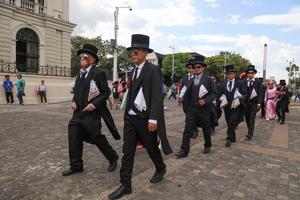 (250810) -- SAN SALVADOR, 10 agosto, 2025 (Xinhua) -- Imagen del 9 de agosto de 2025 de personas portando trajes de danzantes tradicionales de "Los Chapetones" mientras participan en un festival en el marco de la celebración del Día Internacional de los Pueblos Indígenas, en el departamento de San Salvador, capital de El Salvador, (Xinhua/Alexander Peña) (ap) (oa) (da)