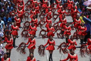(250801) -- SAN SALVADOR, 1 agosto, 2025 (Xinhua) -- Porristas participan en un desfile durante la inauguración de la temporada vacacional de las Fiestas Agostinas, en el departamento de San Salvador, El Salvador, el 1 de agosto de 2025. (Xinhua/Alexander Peña) (ap) (oa) (ra) (ce)