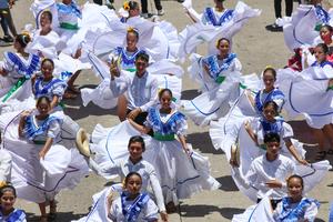 (250801) -- SAN SALVADOR, 1 agosto, 2025 (Xinhua) -- Un grupo de danza folclórica participa en un desfile durante la inauguración de la temporada vacacional de las Fiestas Agostinas, en el departamento de San Salvador, El Salvador, el 1 de agosto de 2025. (Xinhua/Alexander Peña) (ap) (oa) (ra) (ce)