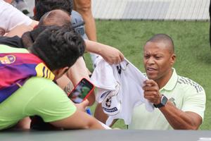 (251107) — SAN SALVADOR, 7 noviembre , 2025 (Xinhua) — El jugador, Julio Baptista (d), firma autógrafos durante un entrenamiento previo al partido de leyendas entre FC Barcelona y Real Madrid, en el Estadio Nacional Jorge «Mágico» González, en el departamento de San Salvador, capital de El Salvador, el 7 de noviembre de 2025. (Xinhua/Alexander Peña) (ap) (oa) (ra) (ce)
