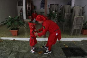 (250414) -- SANTA ANA, 14 abril, 2025 (Xinhua) -- Un hombre ayuda a su hijo a ponerse el traje de "talcigüín" para participar en la tradición de "Los Talcigüines" del municipio de Texistepeque, en el departamento de Santa Ana, El Salvador, el 14 de abril de 2025. (Xinhua/Alexander Peña) (ap) (rtg) (ah) (ce)