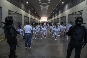 (250405) -- TECOLUCA, 5 abril, 2025 (Xinhua) -- Imagen del 4 de abril de 2025 de presuntos miembros de pandillas realizando ejercicios mientras son custodiados por agentes penitenciarios en un bloque de celdas en el Centro de Confinamiento del Terrorismo, en Tecoluca, en el departamento de San Vicente, El Salvador. (Xinhua/Alexander Peña) (ap) (jg) (da)