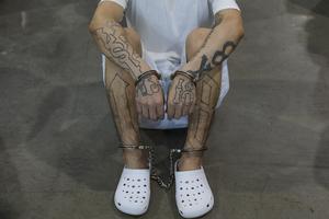 (250405) — TECOLUCA, 5 abril, 2025 (Xinhua) — Imagen del 4 de abril de 2025 de un presunto miembro de una pandilla esposado de pies y manos en un bloque de celdas en el Centro de Confinamiento del Terrorismo, en Tecoluca, en el departamento de San Vicente, El Salvador. (Xinhua/Alexander Peña) (ap) (jg) (da)