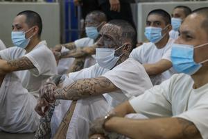 (250405) -- TECOLUCA, 5 abril, 2025 (Xinhua) -- Imagen del 4 de abril de 2025 de presuntos miembros de pandillas descansando en un pabellón en un bloque de celdas en el Centro de Confinamiento del Terrorismo, en Tecoluca, en el departamento de San Vicente, El Salvador. (Xinhua/Alexander Peña) (ap) (jg) (da)