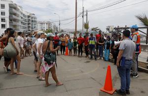 (250213) -- LIMA, 13 febrero, 2025 (Xinhua) -- Personas se reúnen alrededor de un círculo de seguridad después de evacuar una playa durante el Primer Simulacro ante Tsunami en la playa San Bartolo, en el sur de Lima, Perú, el 13 de febrero de 2025. (Xinhua/Mariana Bazo) (mb) (rtg) (ra) (vf)