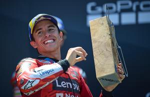 (250609) -- MADRID, 9 junio, 2025 (Xinhua) -- Imagen del 8 de junio de 2025 de Marc Márquez, de Ducati Lenovo, posando en el podio al término del Gran Premio de Aragón de MotoGp, en el circuito de Motorland Aragón, en Alcañiz, España. (Xinhua/Str) (oa) (rtg) (ce)