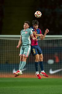 (250226) -- BARCELONA, 26 febrero, 2025 (Xinhua) -- Imagen del 25 de febrero de 2025 de Pau Cubarsi (d), de FC Barcelona, disputando el balón con Julián Alvarez, de Atlético de Madrid, durante el partido de fútbol de la semifinal de ida de la Copa del Rey entre FC Barcelona y Atlético de Madrid, en Barcelona, España. (Xinhua/Joan Gosa) (ah) (ra) (vf)