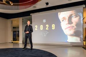 (251016) -- BARCELONA, 16 octubre, 2025 (Xinhua) -- Imagen del 15 de octubre de 2025 del futbolista neerlandés, Frenkie de Jong, de FC Barcelona, reaccionando durante una conferencia de prensa en la Oficina Comercial de FC Barcelona, en Barcelona, España. Frenkie de Jong firmó un nuevo acuerdo hasta el 2029, anunció FC Barcelona el miércoles. (Xinhua/Joan Gosa) (rtg) (ra)