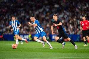 (250516) -- BARCELONA, 16 mayo, 2025 (Xinhua) -- Imagen del 15 de mayo de 2025 de Dani Olmo (d), de FC Barcelona, disputando el balón con Edu Expósito, de RCD Espanyol, durante el partido de fútbol de la Laliga entre FC Barcelona y RCD Espanyol, en el RCDE Stadium, en Cornellá, España. (Xinhua/Joan Gosa) (oa) (ra) (vf)