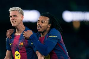 (260126) -- BARCELONA, 26 enero, 2026 (Xinhua) -- Imagen del 25 de enero de 2026 de Dani Olmo (i), de Barcelona, festejando con Jules Koundé, de Barcelona, durante el partido de fútbol de LaLiga entre Barcelona y Real Oviedo, en el Spotify Camp Nou, en Barcelona, España. (Xinhua/Joan Gosa) (oa) (ah) (vf)